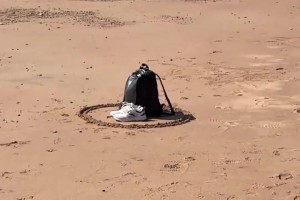 游客在海边游玩,把包和鞋子放在沙滩上画圆圈圈起来